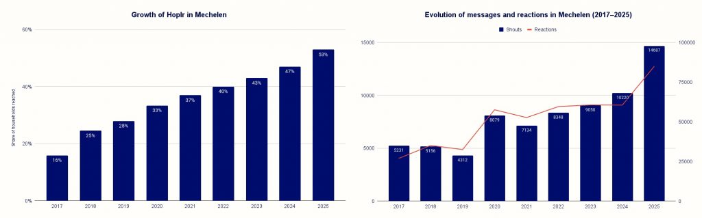 Today, the data shows how deeply Hoplr is anchored in Mechelen’s neighborhood life: thousands of messages, tens of thousands of interactions, and thousands of residents finding each other monthly – online and offline – via the platform.