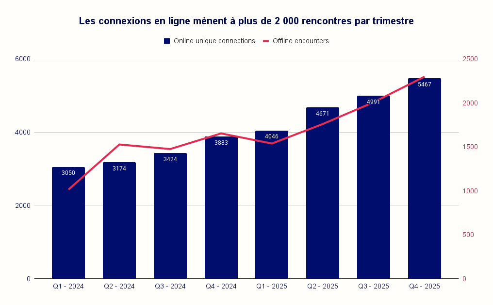 Cette connexion a le vent en poupe. Si l’on regarde début 2024, les chiffres étaient encore d’environ 3 000 connexions numériques et 1 000 rencontres hors ligne par trimestre. Fin 2025, ces nombres ont presque doublé. En d’autres termes, le réseau ne devient pas seulement plus grand, mais il est aussi utilisé plus intensément.