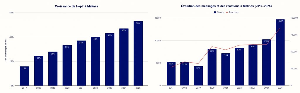 Aujourd’hui, les données montrent à quel point Hoplr est ancré dans la vie de quartier malinoise : des milliers de messages, des dizaines de milliers d’interactions et des milliers d’habitants qui se retrouvent chaque mois – en ligne et hors ligne – via la plateforme.